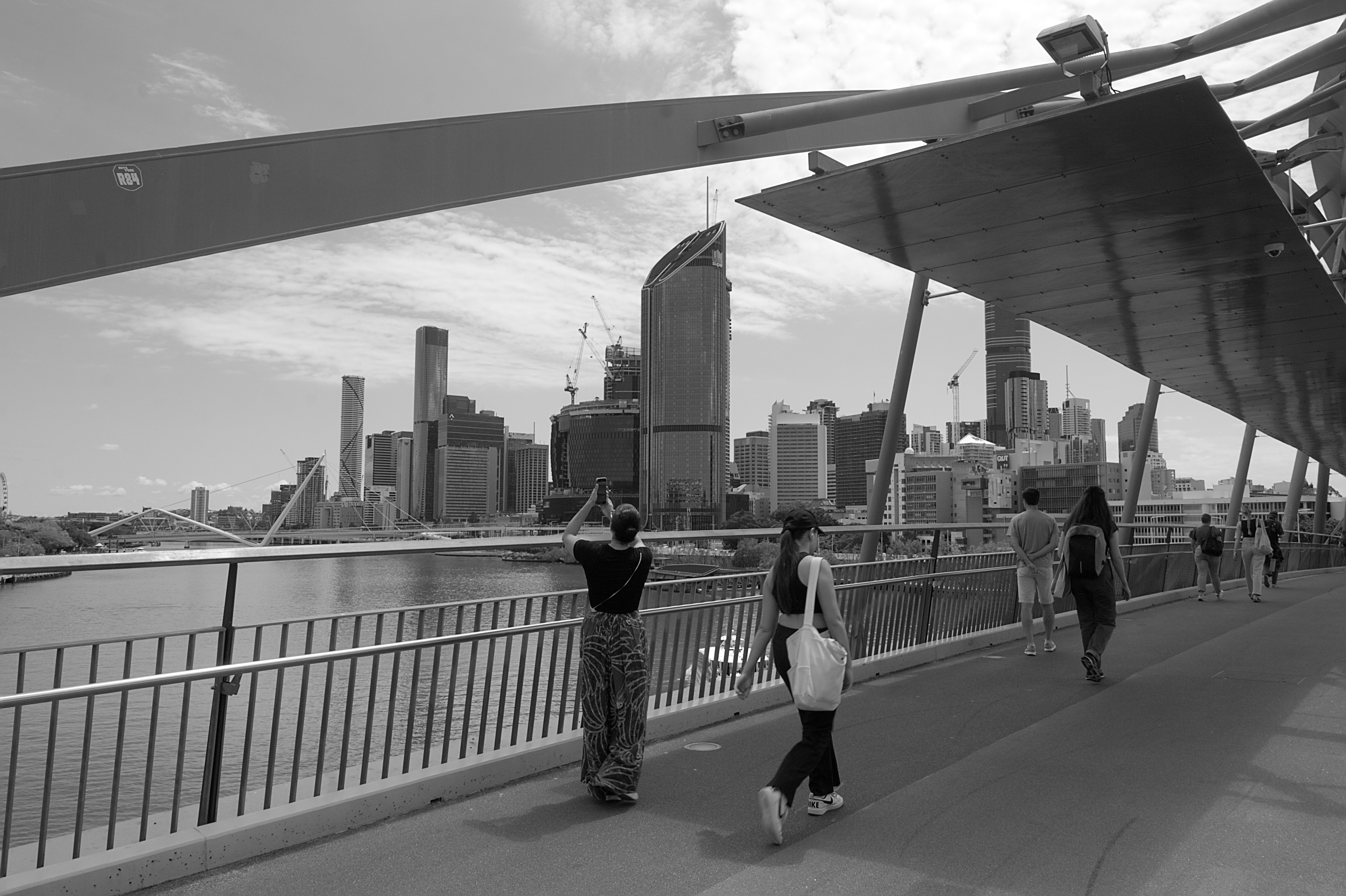 Le pont Goodwill de Brisbane permet aux piétons et aux cyclistes de relier la rive sud au jardin botanique, tout en offrant une belle vue sur le centre ville (CBD : Central Business District)
